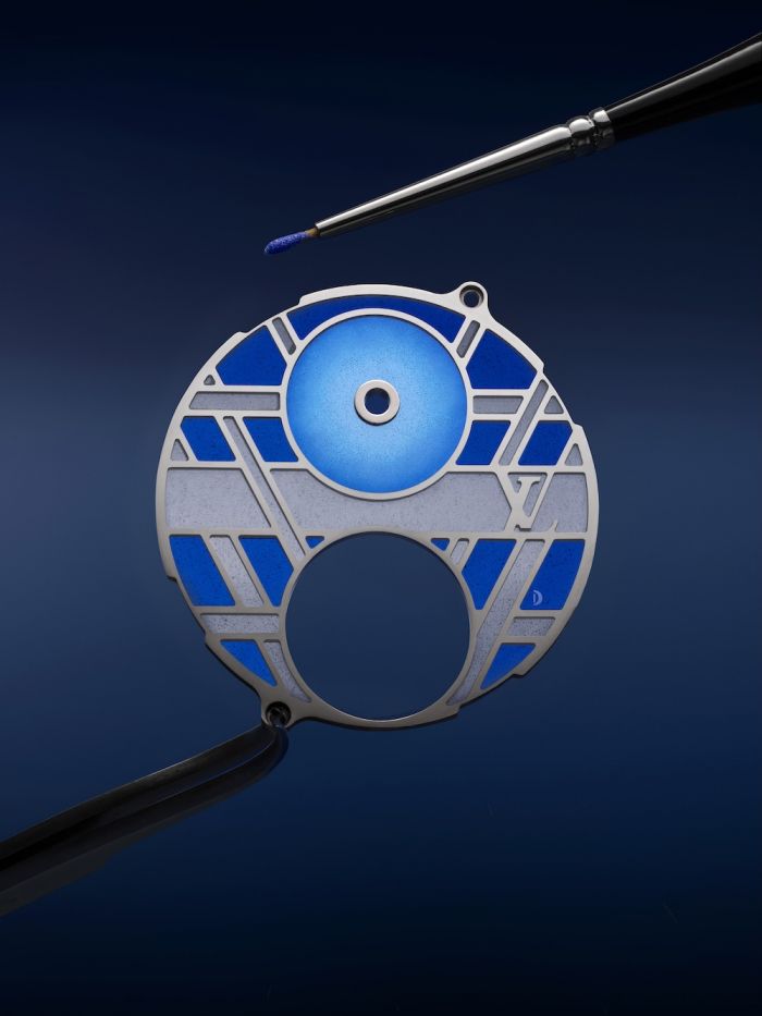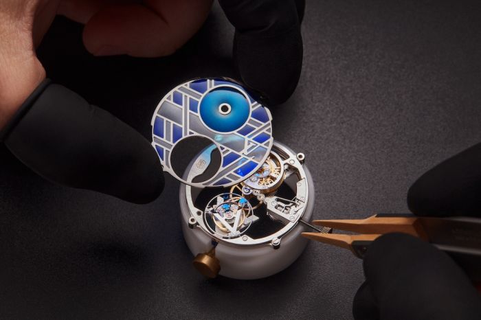 The artisan must apply the enamel in multiple layers and kiln-fire it each time to achieve the correct transparency, which, when completed, echoes a stained-glass window. More than 100 hours of artisanal work are required to complete each dial.