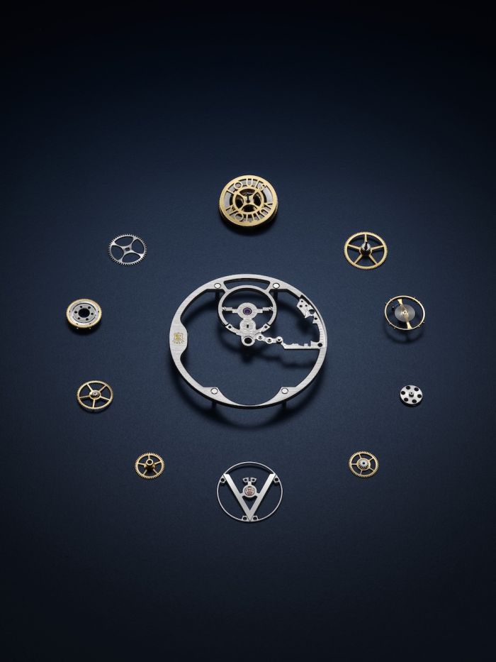 Movement: LV 104 Calibre: mechanical movement with manual winding developed and assembled by La Fabrique du Temps Louis Vuitton, “Poinçon de Genève” certification, visible on the face and back. Functions: Skeleton flying tourbillon, hours and minutes, V tourbillon cage fully rotating in one minute. Eighty hours of power reserve, 21,600 oscillations per hour.