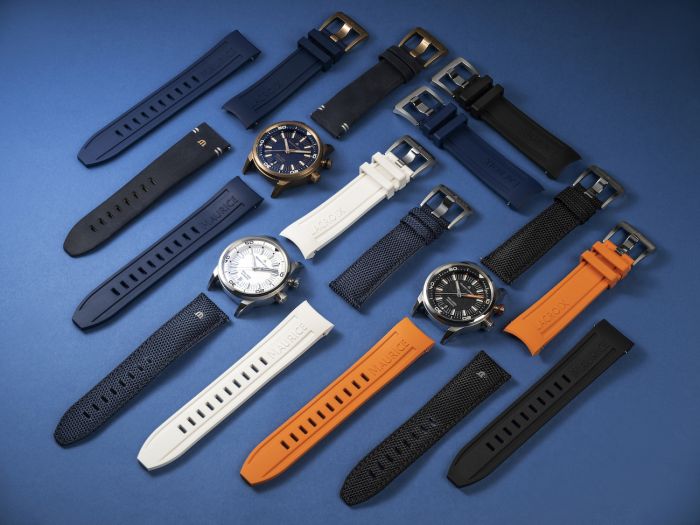 The bronze version comes supplied with two straps, one in dark blue leather and the other in dark blue rubber. Maurice Lacroix supplies the steel models with three matching straps: an M-branded fabric strap and two rubber straps.