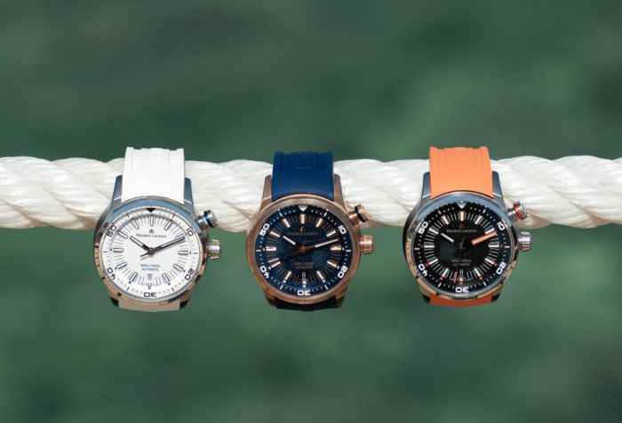 Maurice Lacroix also retains the watch’s useful internal rotating bezel to indicate elapsed time, adjusted using the crown at the 2 o’clock position. The second crown at the 3 o’clock position is used to adjust the time, and date and to wind the automatic ML115 movement. All models are water-resistant to 300 meters.