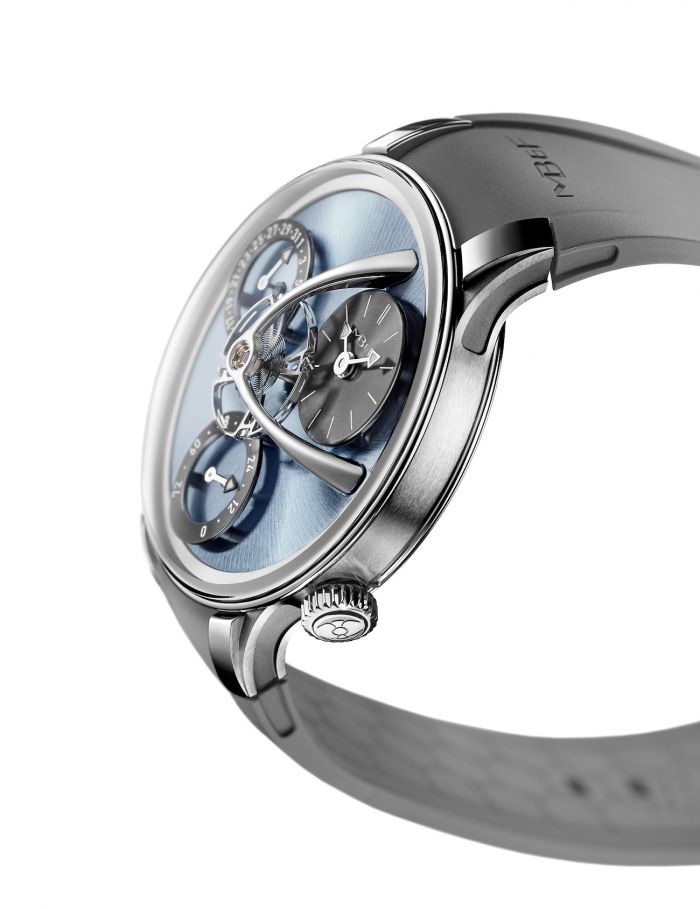 Launched during Geneva Watch Days, the new Legacy Machine Split Escapement EVO version offers two modifications to existing models. One is the dial color, now a cool, icy light blue with grey subdials. The second change is that MB&F has rotated the entire mechanism clockwise by 30 degrees, creating a new sense of asymmetry in the LM Split Escapement dial.