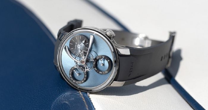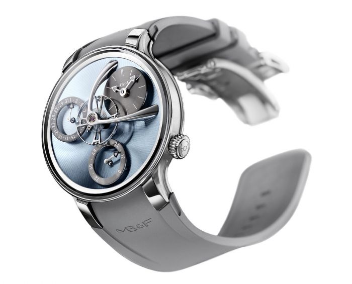 That model, limited to twenty-five units, comes with a black base plate, metallic blue dial, and open counters. It will be the only MB&F LAB edition released this year.