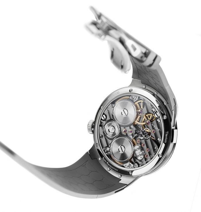 The watch’s new EVO designation means MB&F has dedicated its sporty, bezel-free 44mm EVO case to house the spectacular movement, which, as its name implies, separates or ‘splits’ its escapement into two halves. Earlier LM Split Escapement models were housed in the MB&F’s dressier 44mm gold or titanium case.
