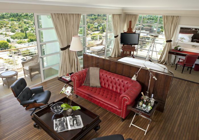 A total of 138 bright and spacious rooms feature across the property each with tasteful European touches, including black-and-white photographs of Italian celebrities from the ’50s and ’60s, coffee table books and Eames lounge chairs. The standout being their private balconies, many of which provide views over Hollywood and beyond. Bathrooms are beautifully finished with marble sinks and bespoke Mr. C amenities – in Signature Suites standalone tubs are raised affairs with port windows located close by that look into the bedroom. Mr. C Suites are finished in white, including tufted leather sofas and headboards while Signature Suites boast a dramatic red color scheme – both channel a nautical aesthetic thanks to wooden flooring and balcony railings more akin to a vintage sailboat.