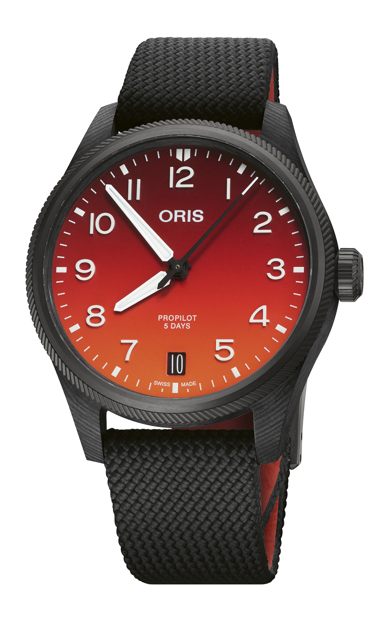 According to the Oris, the process is so precise that you can create a pattern on the case. Most carbon fiber watch cases develop random patterns.