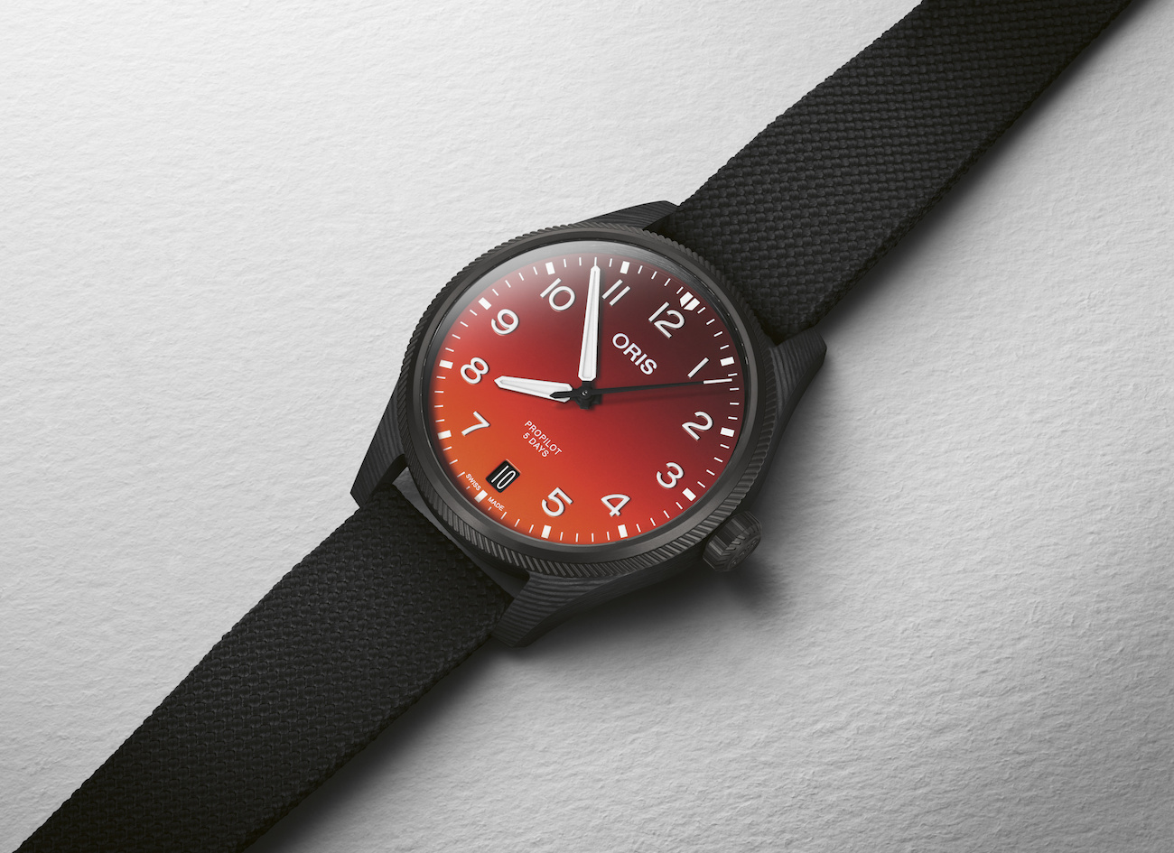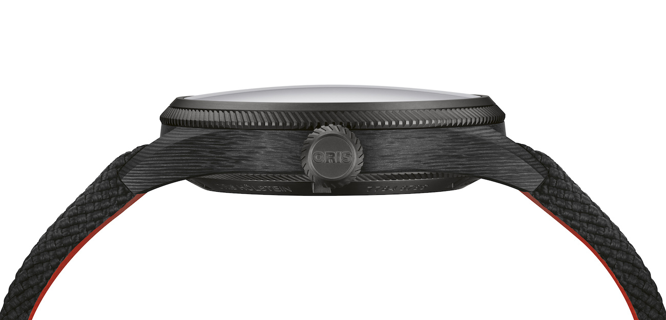 Oris created the 41mm case with the assistance of Switzerland’s ETH Zurich university (Swiss Federal Institute of Technology). Researchers there utilized a high-grade polymer PEKK developed for the aerospace industry. Technicians weave the material with carbon fiber to create a rigid, ultra-lightweight material.