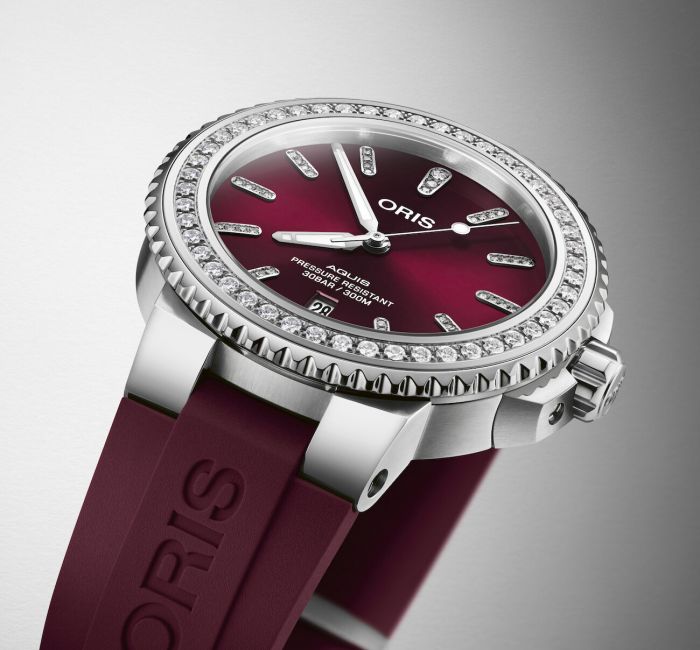 With a rich cherry red sunray dial, the new model is the first watch from Oris with this particular gem setting. The brilliant-cut lab-grown diamonds, indistinguishable from an Earth-mined diamond of equivalent quality, frame and add luster to the already luxurious dial.