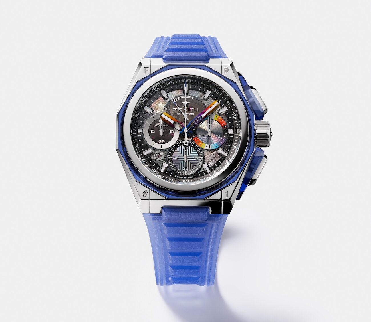 At Pantone’s direction, Zenith also made the watch’s dodecagonal bezel and its pusher protectors from translucent blue YAS (yttrium aluminosilicate), a crystalline glass material comparable to synthetic sapphire. This adds more color to the watch, beyond the dial. Just outside the bezel, the four corners of the case are engraved with “FP#1”, a signature for “Felipe Pantone El Primero”.
