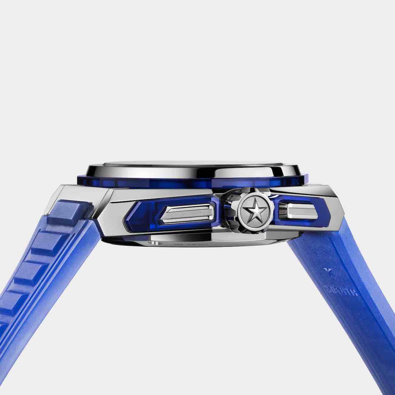 Zenith then matched that translucent blue with an equally translucent blue silicone strap. Zenith also includes a polished steel bracelet and a black Velcro strap with the watch.