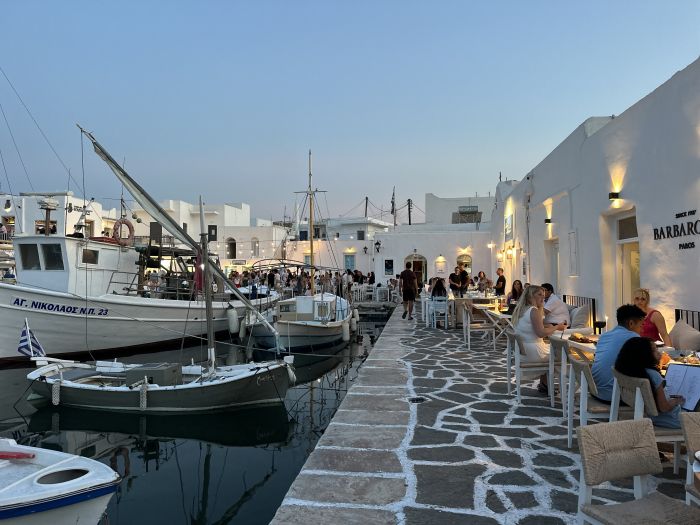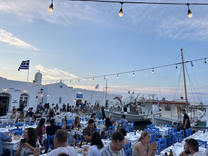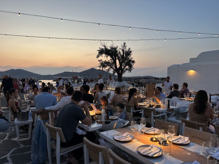 The charming, cosmopolitan fishing village of Naoussa, with narrow cobblestoned streets, chic boutiques, and waterfront seafood restaurants, is a quick 15-minute drive from the Parocks property and a must-visit during a stay. Dining in Naoussa is a feast for the senses, with seaside restaurants focusing on fresh, locally sourced ingredients. Standouts included the popular Barbarossa, located right by the harbor, a favorite among both locals and visitors (for good reason!). This renowned seafood restaurant offers a stunning view of the water (and sunset!) and a very lively atmosphere. Luaz was another extraordinary dining experience in Naoussa, offering guests perfectly cooked seafood plates, artisanal pastas, and dishes with innovative takes on traditional Greek favorites. With a sophisticated yet welcoming ambiance (tables right by the sand, with a gorgeous sunset in the background), it’s the perfect spot for those seeking a memorable and delicious meal on the island.