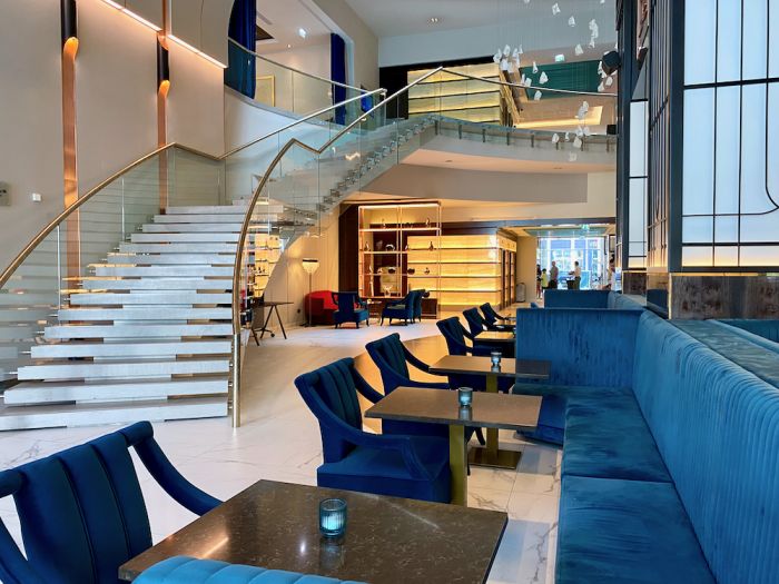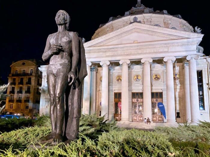 The hotel’s lobby is spacious, with sweeping staircases either side, an abundance of velvety armchairs, deep red, ash gray and turquoise in color, with decorative art deco columns of metal and glass and a dizzying high central atrium stretching many floors, as well as a long bar at the far end from the main Calea Victoriei Boulevard entrance.
