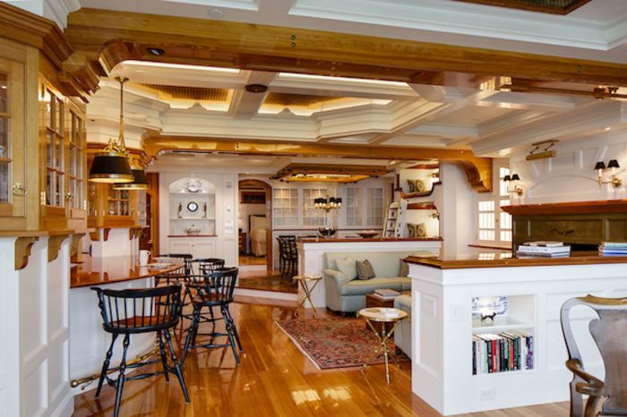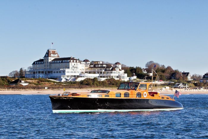 In 2003, Pannell sold Aphrodite to her present owner, Charles Royce, the owner and proprietor of Ocean House. A classic boat enthusiast, Royce began a complete restoration of the yacht to bring her systems up to today’s standards while using the original boat as a template to ensure its authenticity. True to Royce’s nature, and aligned with how he approached Ocean House’s careful restoration in 2004, the first stage of the project was to extensively catalog all aspects of the boat for later reference. Once this historical documentation was completed, reconstruction began with the replacement of the original backbone, stem, floors and the reframing of Aphrodite’s signature torpedo stern. Once the framing work was completed, the hull was then re-planked, as originally built, with two layers of Philippine mahogany and copper rivets. A new deck, along with the crafting of Aphrodite’s distinctive cabin and interior accommodations, was then finalized, and in October of 2005, Aphrodite traveled to its new home in Watch Hill, Rhode Island.