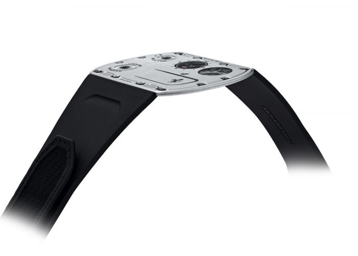 The watch’s titanium-based Caliber RM UP-01 manual-winding movement is also encased within titanium and powers displays for hours, minutes, and a function selector.