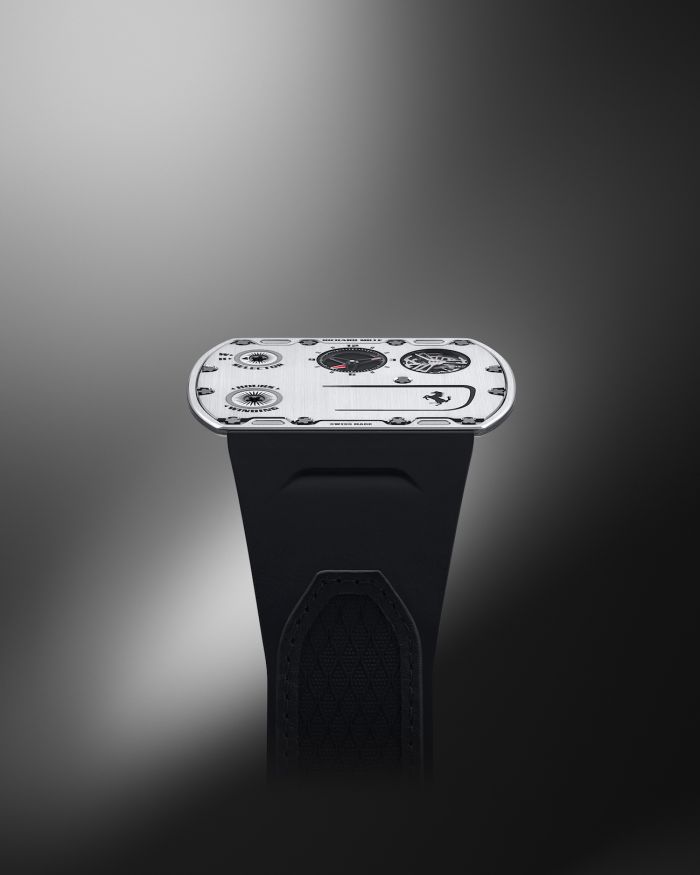Case: 51mm by 39mm x 1.75mm titanium monobloc construction assembled using 13 grade-5 titanium spline screws and abrasion-resistant washers in 316L stainless steel. Surrounding the crowns, two black ceramic inserts protect the bezel from friction and ensure water resistance. The case back and bezel are satin-finished, with polished bevels. Laser-engraved Ferrari prancing horse. Water resistance to 10 meters.