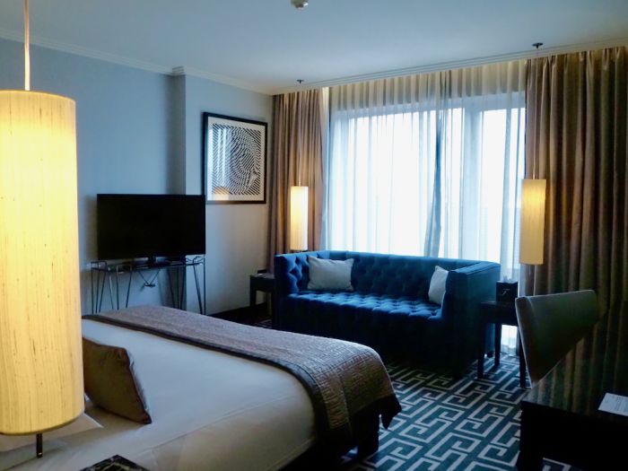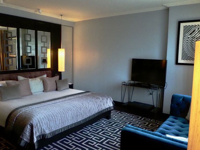 Comfortable furnishings included a turquoise Queen Anne style sofa, a large TV, a long writing desk with smoked glass panels above and four elongated hanging ceiling lamps either side of the room. Interestingly, the black desk and headboard, even the television stand and charcoal carpet reminded me of chic Coco Chanel ambience.