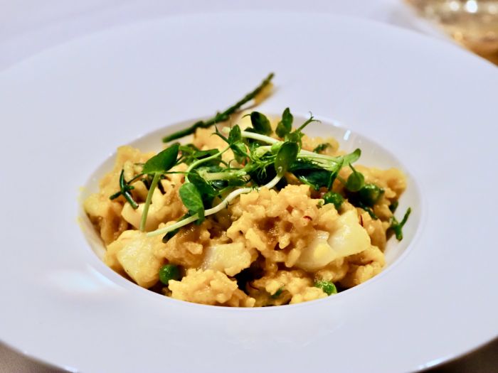 Other entree options include compressed pork belly, duck breast with confit leg, pan fried sea bream fillet with prawn and dill croquette and rack of Irish lamb marinated in Ras El Hanout spice mix of cardamom, nutmeg, anise, mace, cinnamon, ginger, various peppers, and turmeric.