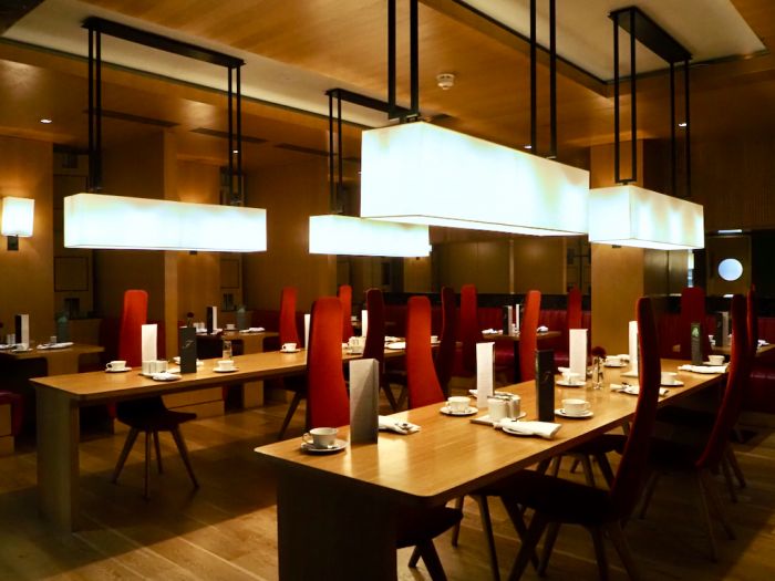 Food with drinks are served at tall, crimson, angular Regal-like seating at long tables in the restaurant, with other guests at one end. Hanging rectangular-shaped lamps resembling window-sill pots with you’d imagine in a celebrity performer’s dressing room. Colorful framed sketches of various well-known Irish drinks such as Bushmills whiskey and Guinness line the walls.
