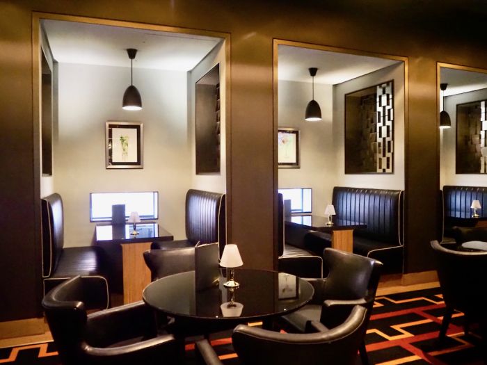 The color scheme is a vivid, eye-catching one, with leather couches, wall-padding and the backdrop to the reception desk all in pink contrasting with gray floor-tiling, wall columns, carpet and soft, throne-like seating. Twenty-foot high-glass walls face the Grosvenor Road, one of Belfast’s main thoroughfares. An open gas-fed fire adds a touch of homey comfort. Upstairs, ambient-lighted corridors, mirrored doors and vintage wall lamps harken back to a bygone era, a golden age in the colorful life of this friendly northern Irish city cradled by the Black Mountain and the River Lagan. Vintage rotary dial telephones in the rooms add to the sense of nostalgia.