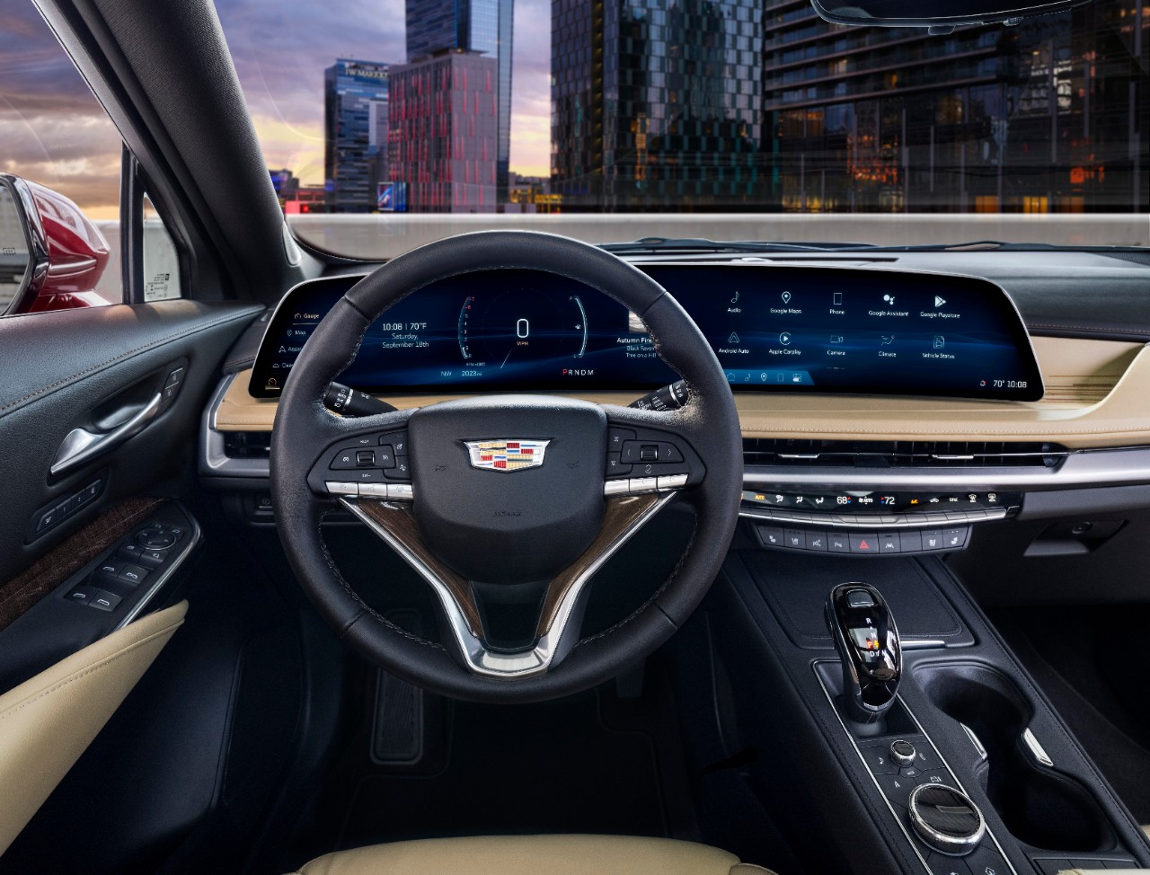 Gary Mack, Creative Designer for Cadillac is proud of the new interior design. ‘It’s more tech forward in ambience,’ said Mack. ‘Drivers appreciate the new 33-inch diameter LED color touchscreen. It’s like the one in the LYRIQ. We pushed the IP (Instrument Panel) down and forward to give the driver a sense of spaciousness.’