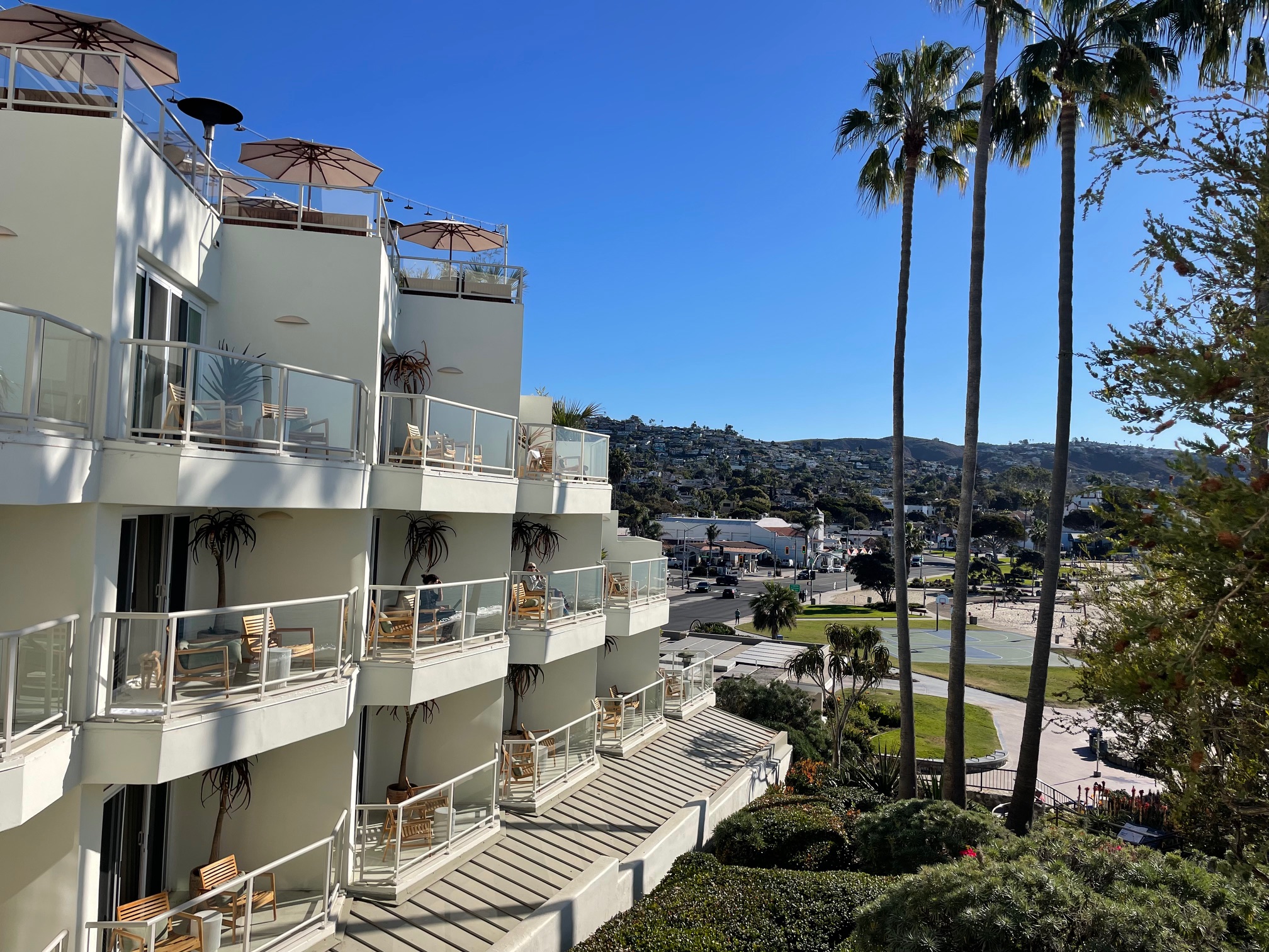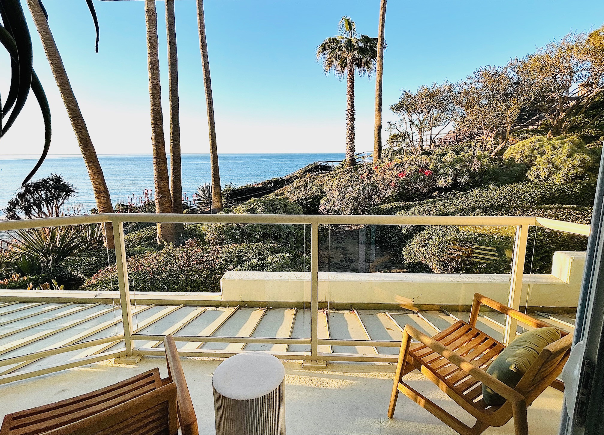 There are 38 rooms with a private balcony or patio, many overlooking towering palm trees, the Pacific Ocean, South Laguna abd Main Beach below. Some rooms overlook the hotel’s sparkling heated swimming pool.