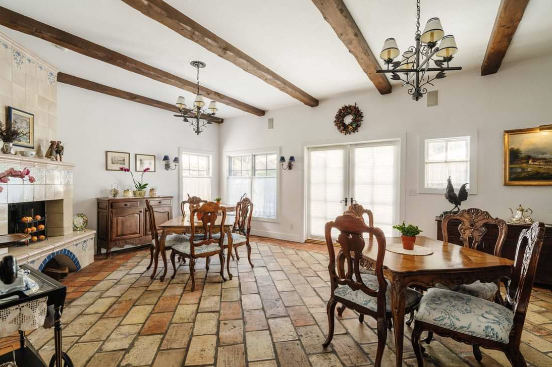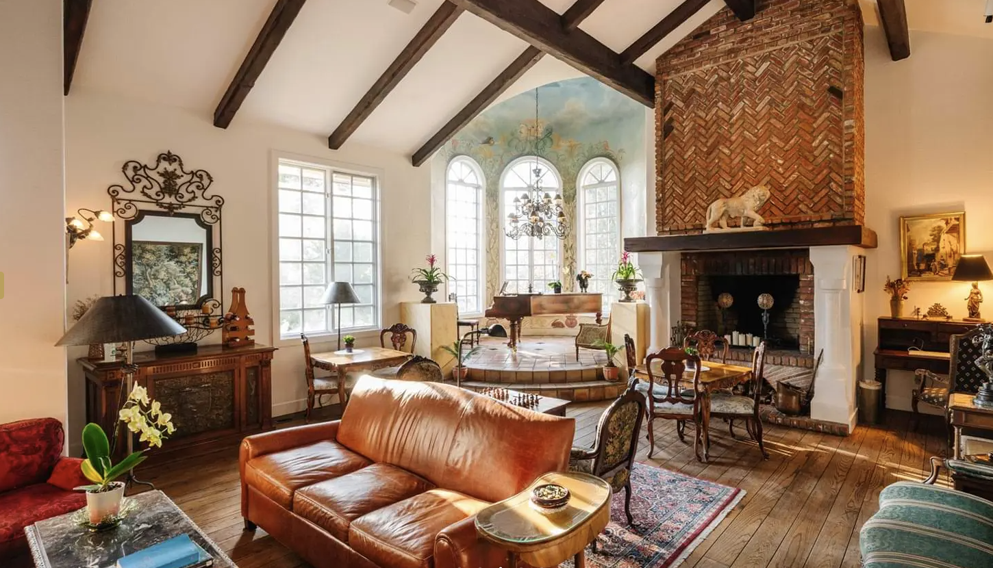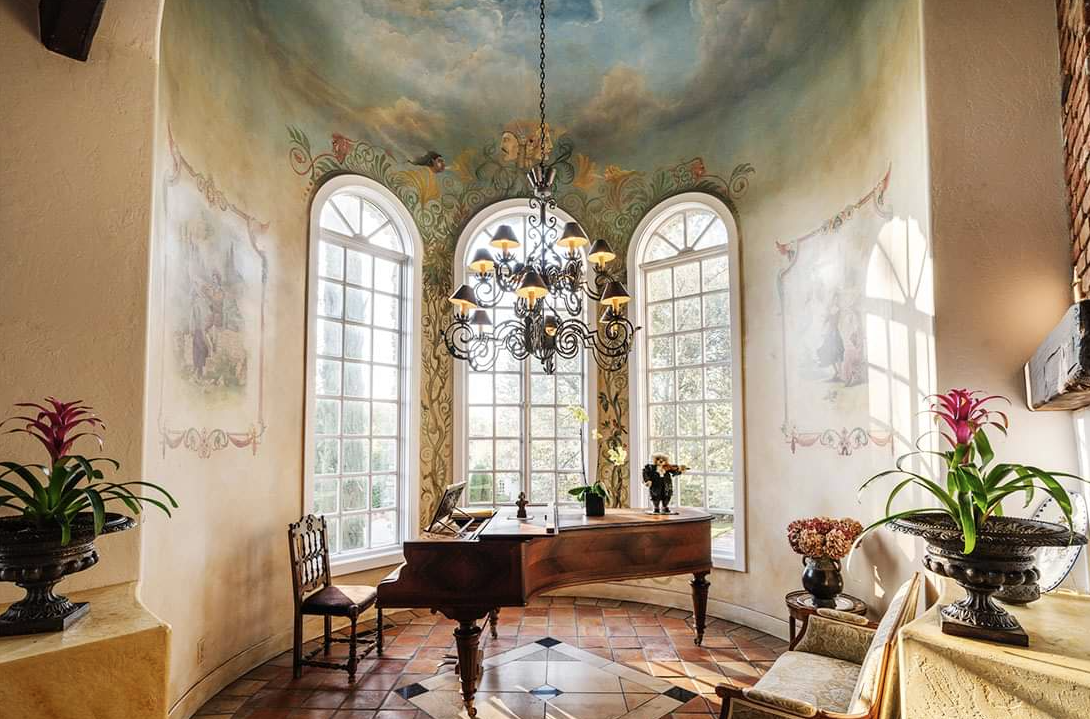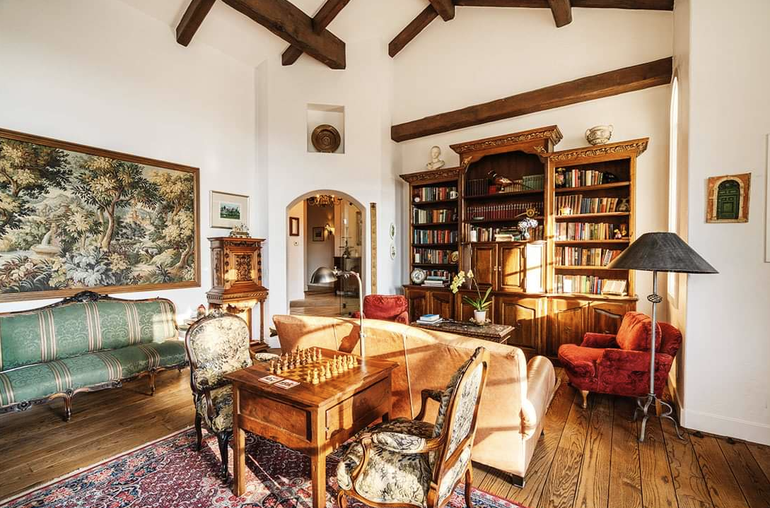 The entrance opens into a salon with a living room feel where guests can sit by the fireplace, enjoy a cup of tea, read a book, or play the piano.