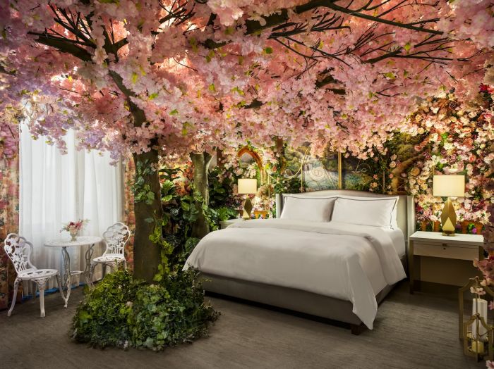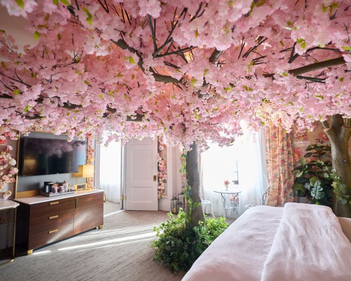For those who want to stay surrounded by the season’s beauty, the hotel’s ‘Suite in Bloom’ is an experience all its own, imagined right out of a fairytale. Inside the Landmark Building, Martinez has designed a private floral wonderland where thousands of silk flowers spill from the ceilings and wind across the walls. Trees of soft pink cherry blossoms, glowing chandeliers, and cozy garden seating create the feeling of stepping into a storybook. The suite, which can sleep up to four, includes a king bed, a separate parlor with a queen bed, and the option to add a connecting room. It’s available through July 31, with rates starting at $849, and includes a bottle of sparkling rosé and floral macarons to complete the picture.