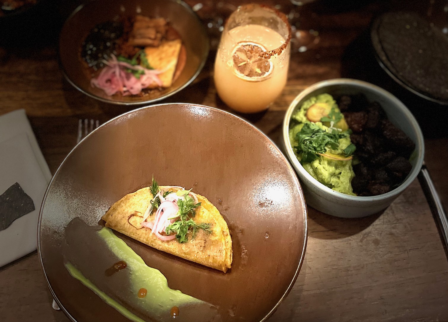 Ensalada de Tomates (Tomato Salad) with toasted corn kernels, cured sheep’s cheese and a delightful hibiscus vinaigrette. The guacamole is served with cubes of rib-eye chicharron, and the slow cooked barbacoa beef taco dazzles with Mexican chili oil and an avocado puree.
