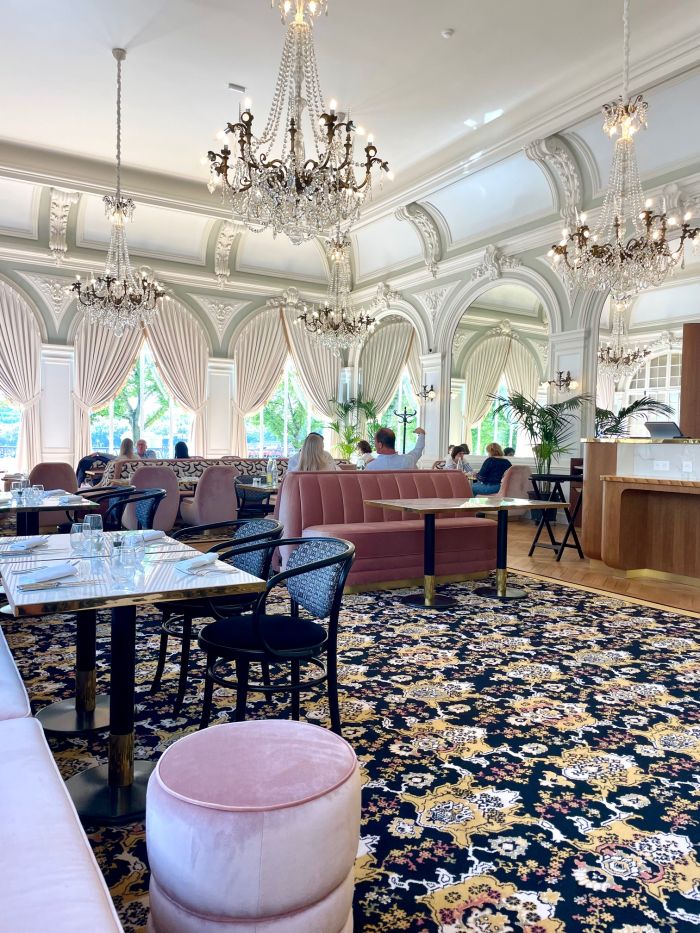 Walking up the main stairway built in 1907, guests will reach Café Pierre Hermé. This fit-for-a-king cafe’ by Chef Pierre Hermé has a soaring ceiling, crystal chandliers, and panoramic views of Place d’Armes.
