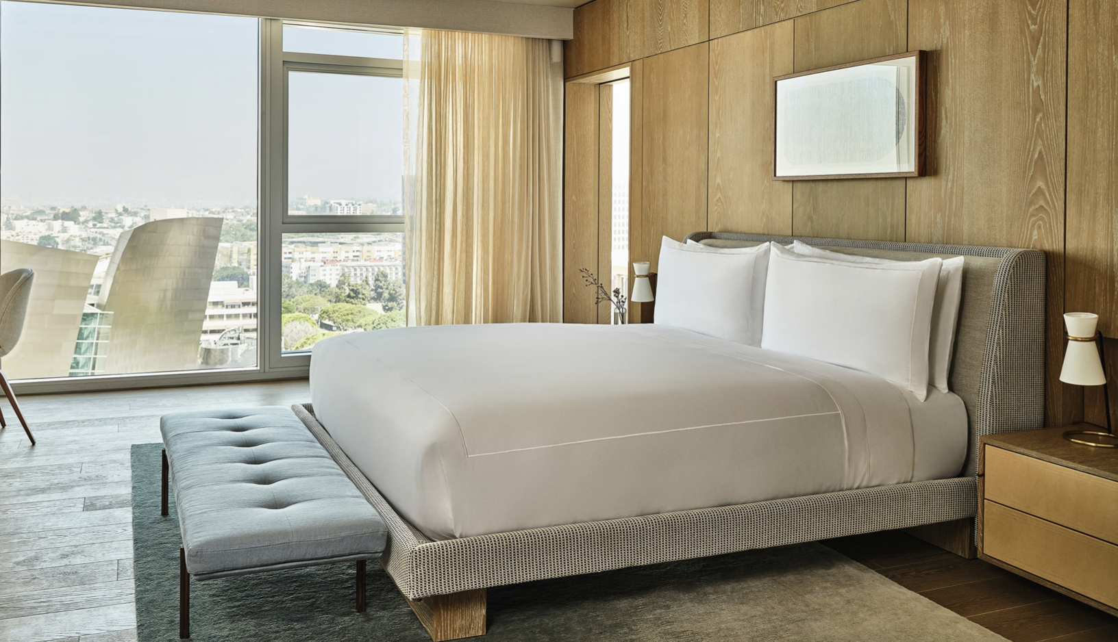 This 305-room hotel has guestrooms on floors 11-28 offering dramatic views of the Walt Disney Concert Hall and Music Center LA, Dodger Stadium and greater Los Angeles to Palos Verdes and Catalina Island.
