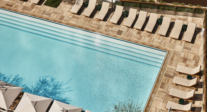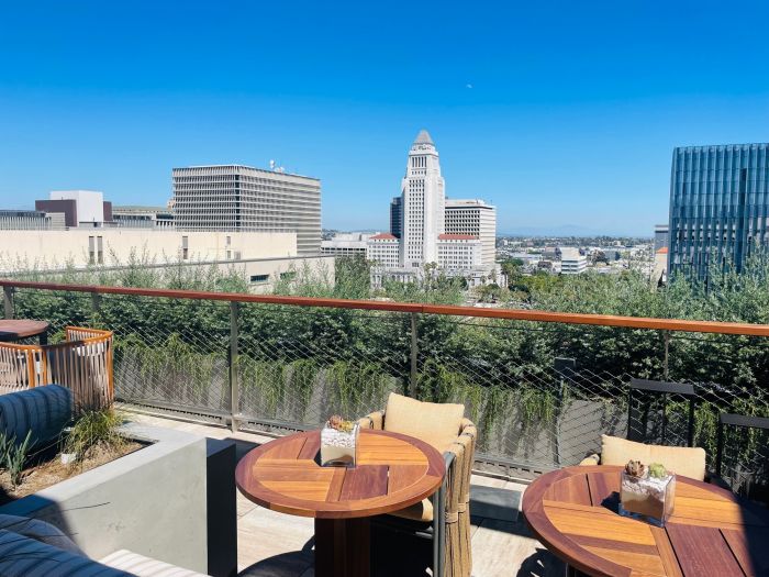 Dining is also available on the pool deck showcasing a refreshing swimming pool and downtown LA views. Guests sitting on shaded lounge chairs or semi-private cabanas can order from the vibrant Airlight menu. Highlights include handheld bites and grilled vegetable and protein skewers. Creative cocktails include tiki punch bowls and to cool down even more, house-made push pops.