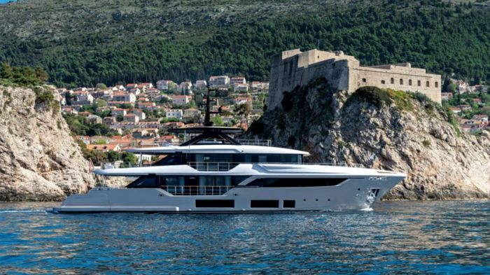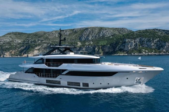 The Navetta 83 can accommodate up to 20 people in five guest cabins and four crew cabins. Two MAN V12-1400CR engines rated at 1,400 horsepower each provide propulsion. The boat can reach a maximum speed of 15 knots and maintain a cruising speed of 12 knots.