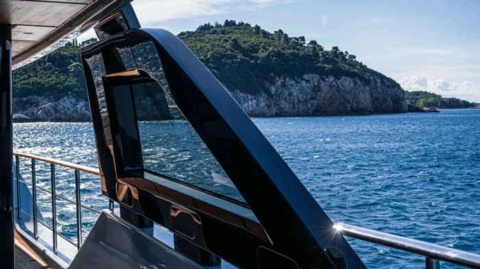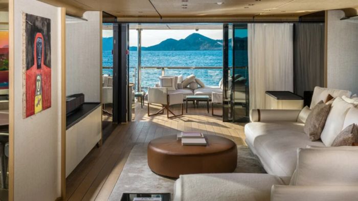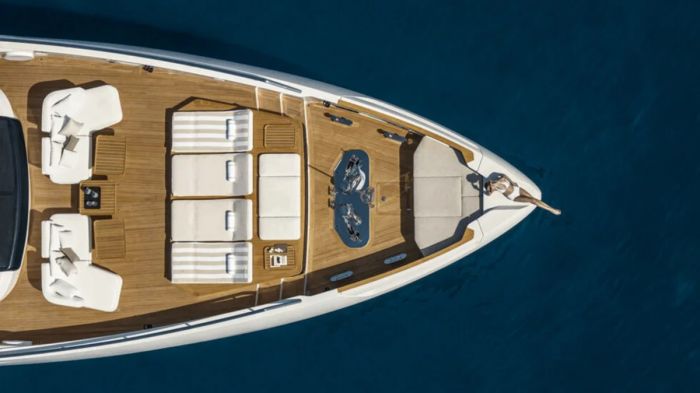 Here, you can find sunbeds, lounge chairs, and even a jacuzzi. Just below is the upper deck, where the wheelhouse, sky lounge, and an al-fresco dining area are located. Meanwhile, a full-beam beach club with folding terraces can be found on the main deck.