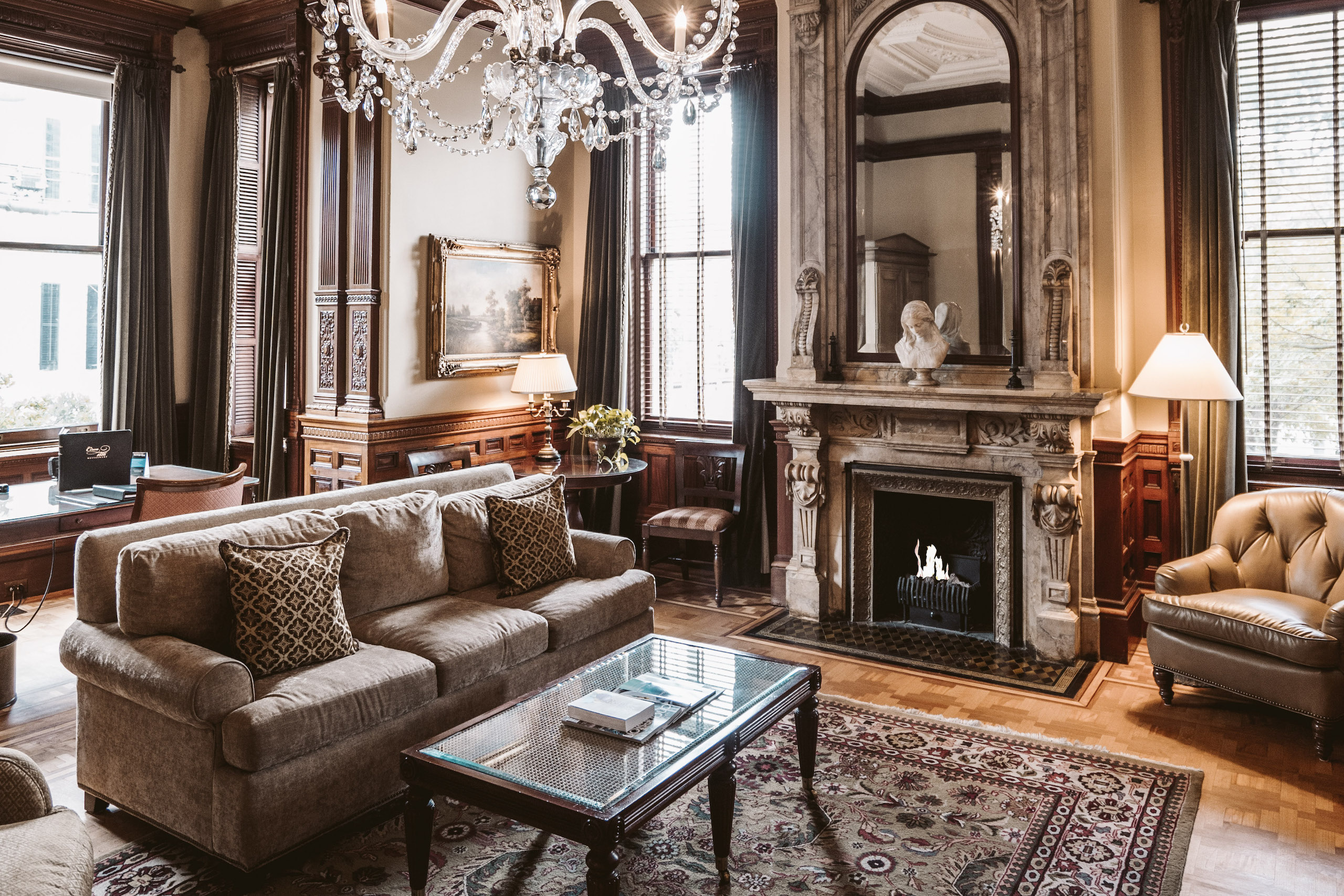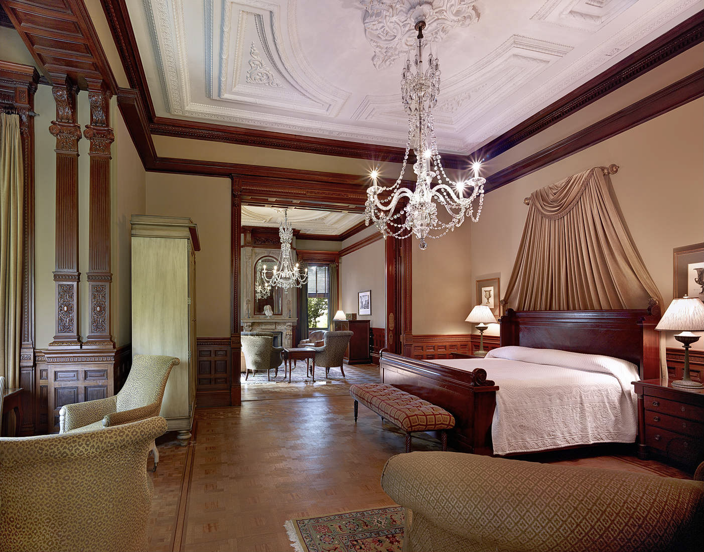 Inside,  the mansion reveals itself as a living and functioning museum of 19th-century artistry transformed into a 21st century luxury boutique hotel. The grand staircase, carved from a single oak tree, spirals upward beneath a stained-glass skylight by Louis Comfort Tiffany. In the parlors, fluted columns frame fireplaces of Verde Antique marble, while pocket doors slide silently on brass tracks.