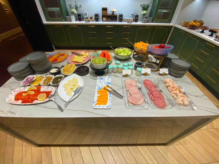 Guests can enjoy a bevy of breakfast and brunch options in the Gold Lounge, as well as snacks and beverages throughout the day. The Lounge brunch/breakfast includes a huge variety of cheeses, deli meats, smoked salmon and assorted fruits. There is also a nice selection of breads, bagels, cereals and granola and four fresh squeezed juices that change daily. A huge Nespresso cappuccino machine provides lattes, cappuccinos, coffees and espressos and each day there is a different choice of egg, bacon, waffles, sausages, and other main breakfast dish choices.