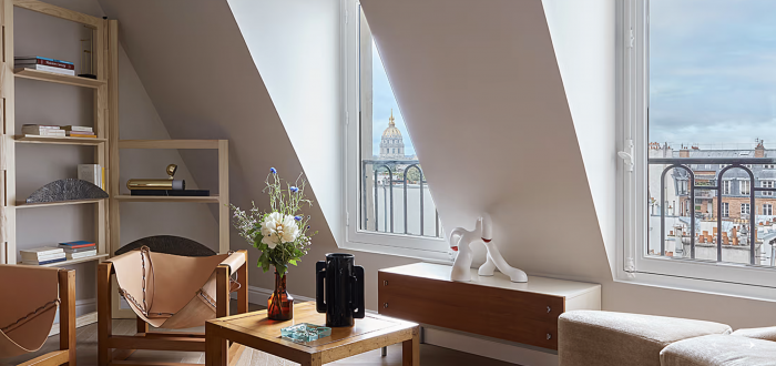 Intentionally low seat height enhances the lounging experience, inviting guests to relax, read a book, and take in the views of Paris from the glass windows inside Appartement Du Collectionneur.