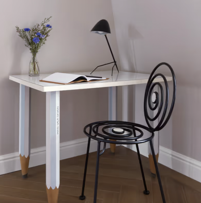 Paris furniture designer Pierre Sala’s pencil leg table is used as a workspace or writing table for guests. This designer comes from the theater world, and his creative imagination inspires his whimsical furniture pieces.