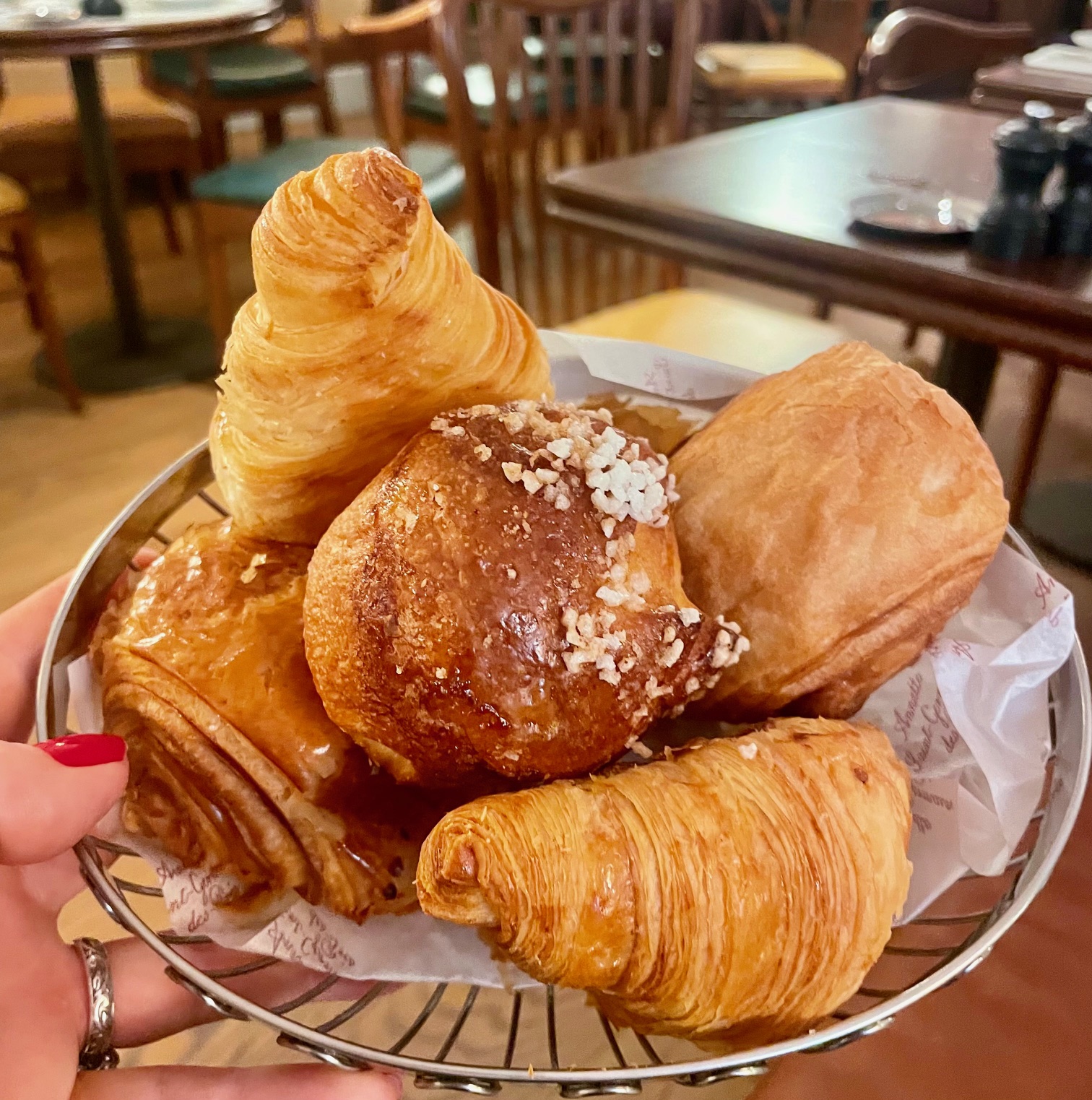 The bread basket is filled with a buttery and flaky croissant, a sweet Pain au Chocolat, light and airy French breakfast puff, and a delicious baked pains aux raisins with a little vanilla cream and plump raisins buried in a flaky circular crisp puff pastry. Slices of French baguette complete this basket.