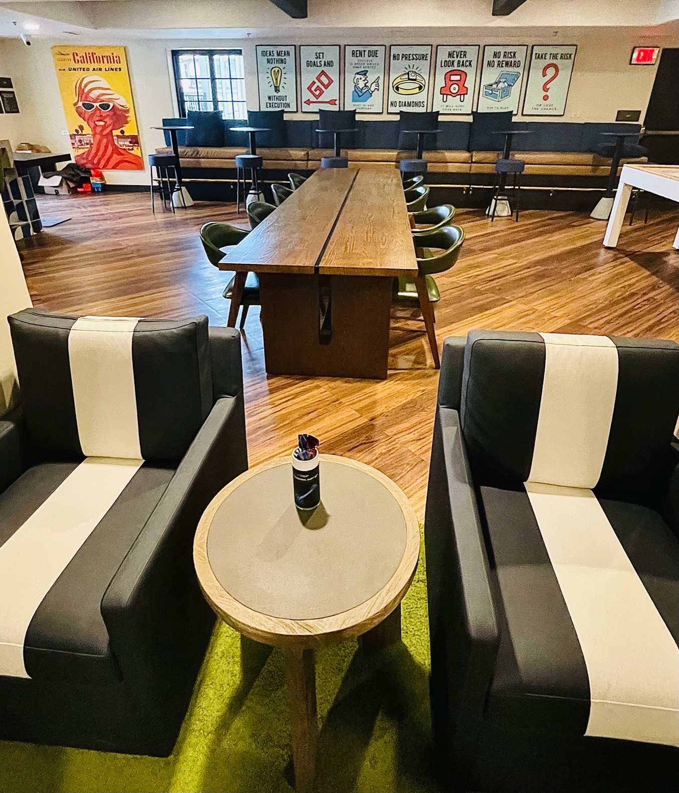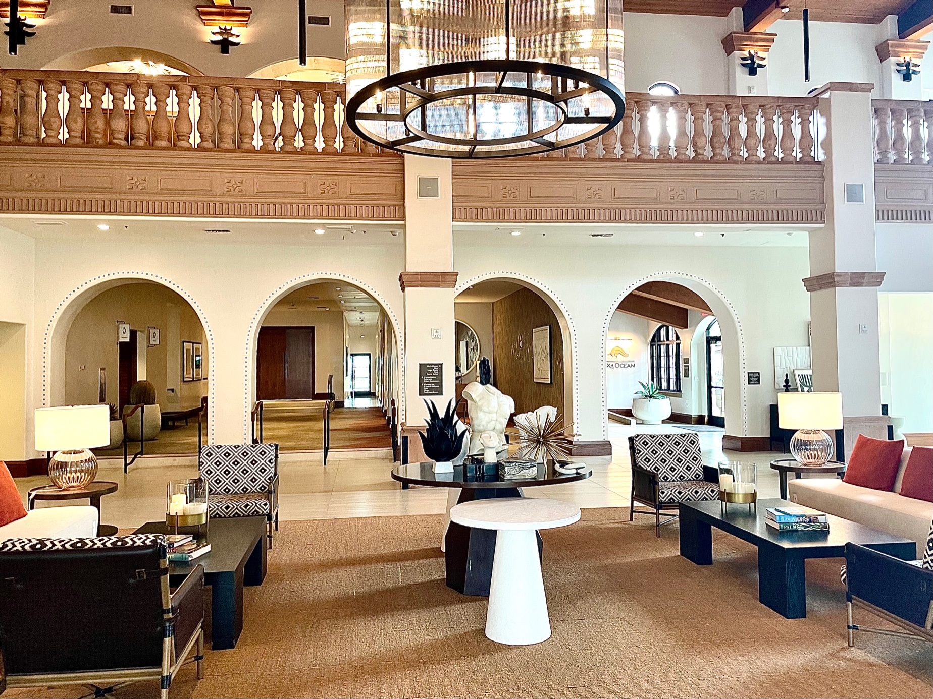 The sophisticated lobby also offers an inviting work area at a high table near a window overlooking the resort play deck and pool. Off of the lobby is the arched entrance to the restaurant Ox & Ocean and entry to Henry’s Sundries & Rental Gear Shop.