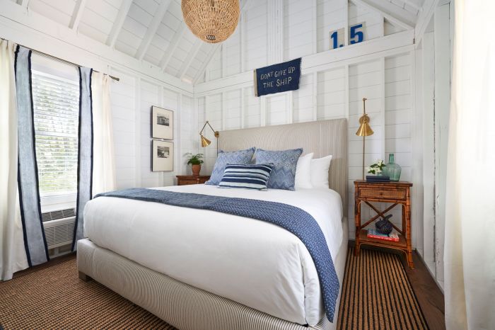 Each nautically designed cottage features an all-white interior with shiplap, cathedral ceilings and exposed beams, brass lighting, and black and white photos that don the walls. The large cottages offer a separate living area, but do not allow pets.