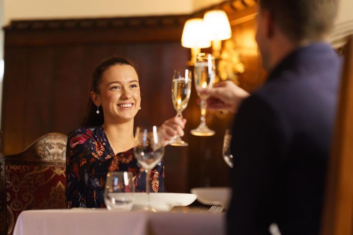 Guests are invited for cocktails and canapes before dinner in the grand hall. As dinner is served, guests are invited into the octagonal-shaped wood paneled dining rooms with oil paintings of British monarchs including an imposing portrait of King Henry VIII that overlooks the venue to ensure all is to his standard. The tables are immaculately set with crisp white tablecloths, custom china, and glasses embossed with the Thornbury Castle emblem.