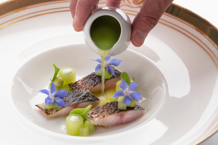 The British-inspired cuisine is sure to impress the most discerning palette. Dining options include three courses, six courses, or a la carte menu of artfully prepared dishes. The menu is based on sustainable, in-season, and locally sourced ingredients. In fact, many of the items that you’ll see on your plate are sourced from the restaurant’s nearby gardens. Dishes you may find include a torched fillet of mackerel with pickled cucumber and horseradish or the Loch Duart salmon with crab, pink grapefruit, and coriander as entrée. Main courses offer choices such as thyme and roasted garlic rack of lamb or the Creedy Carver roasted duck breast. The wine cellar and talented sommeliers impress as well with a wine expertly paired from their selection of 200 wines from England and afar.