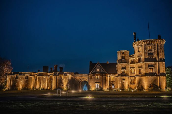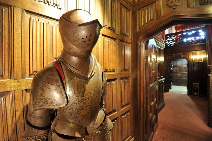 The castle is regal and imposing and is what guests would want in a castle holiday. Guests enter the estate past the guard gate and travel the long driveway where they begin to see the castle façade set behind sprawling lawns of the 15-acre estate dotted with cedar and sequoia trees. Through the arched gateway, they will arrive and see impressive turrets, octagonal towers, Tudor chimneys, and crenelated battlements, and as its centerpiece, a courtyard with a gurgling water fountain.