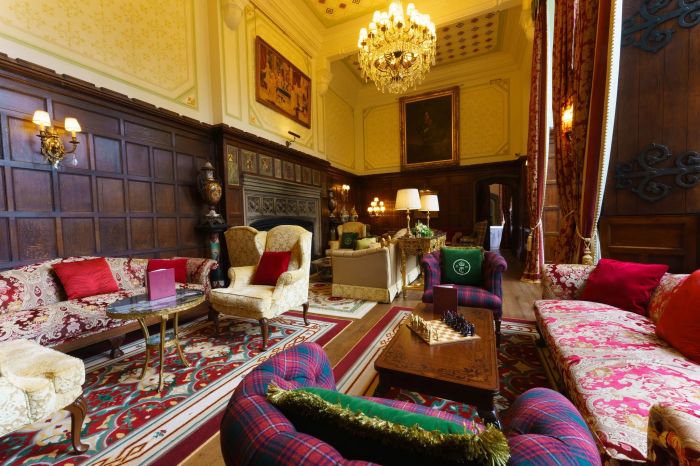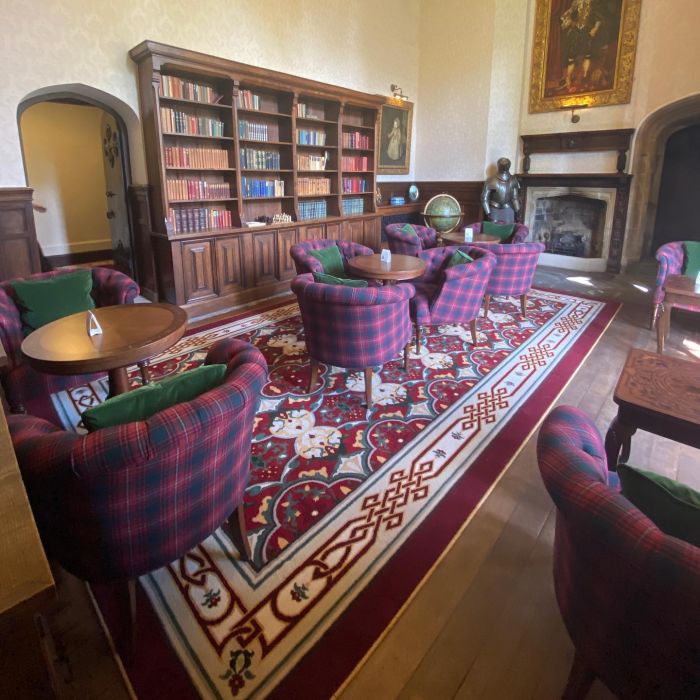 One could sit in the grand hall for hours admiring the design and décor with royal artifacts, colorful sofas, and Chesterfield chairs that mix the modern with the antique. The room features a large hearth fireplace that makes it the ideal place to read a book by the fire, gather with other guests, or where you’ll have your cocktails and canapes before dinner. Further along in the castle, you’ll find more rooms equally as elegant including the library with volumes of leather-bound books on shelves that reach the ceiling. The ground floor also houses the restaurant and several other gathering places to get lost in.