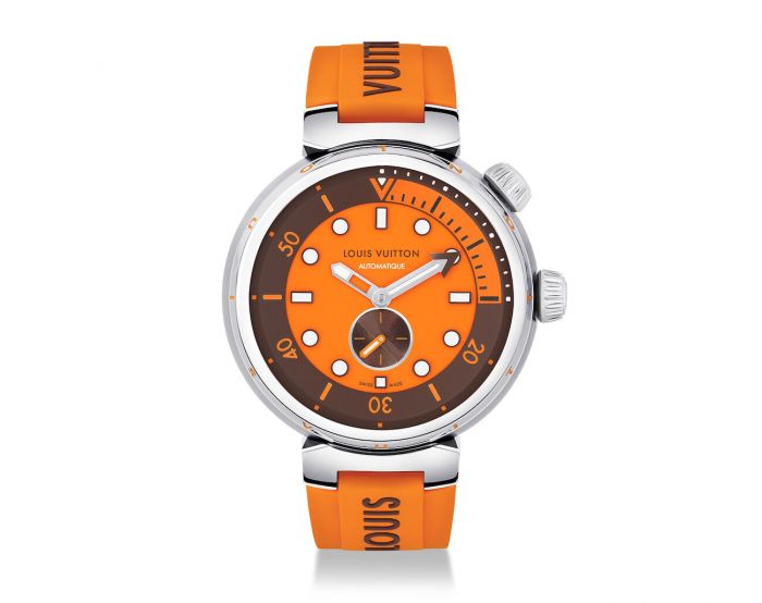 The duo borrows hues from Louis Vuitton’s own historical designs, and in one case (the orange model) recalls traditional dive watch coloring devised to ensure easy legibility underwater and in darkness.