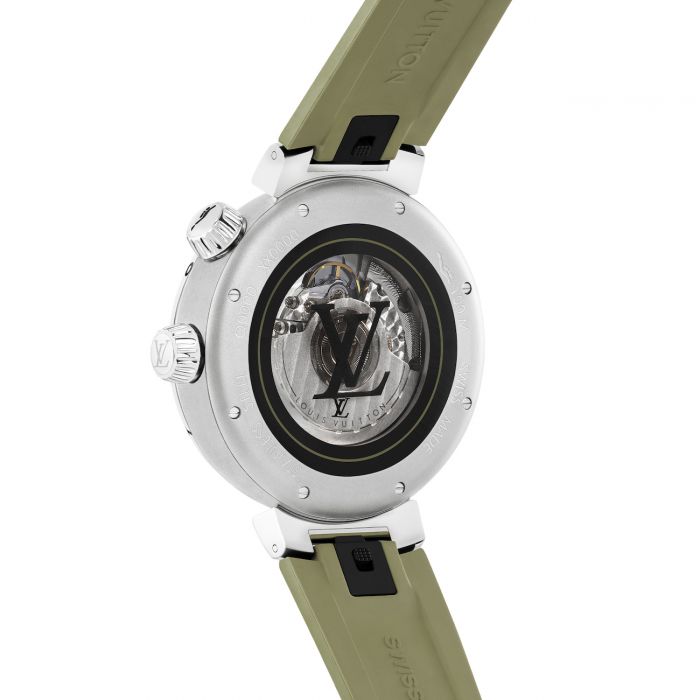 Both offer screw-down crowns to ensure water resistance to 100 meters and each come with a Louis Vuitton-branded interchangeable rubber strap. Price: $7,805.