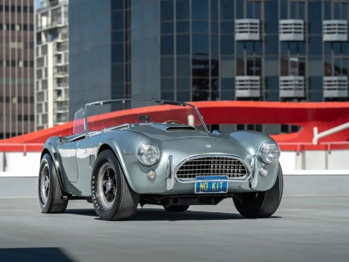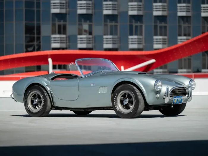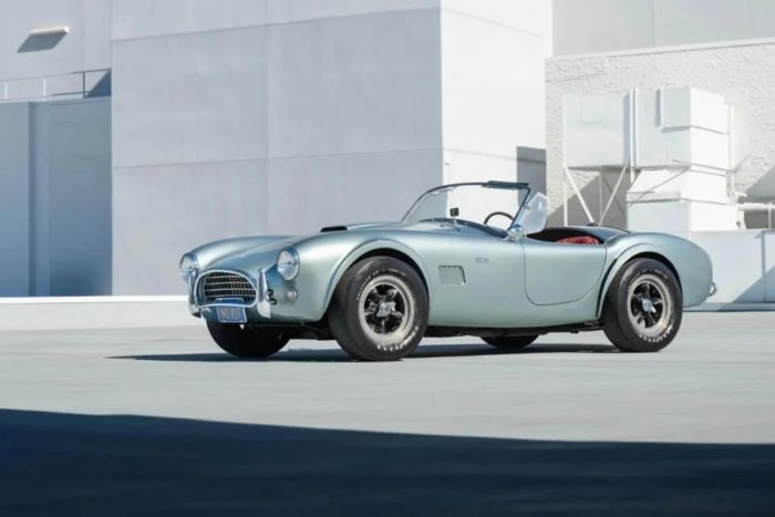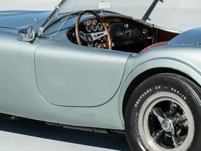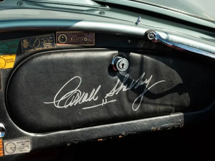 RM Sotheby’s also says the engine number 3493 matches the body, which makes this deal even sweeter. Collectors are surely eyeing the “Snake Charmer” right now. A view of the cockpit shows various badges and even the signature Shelby on the dashboard glove compartment. This machine rides on American five-spoke rims instead of the factory wires.