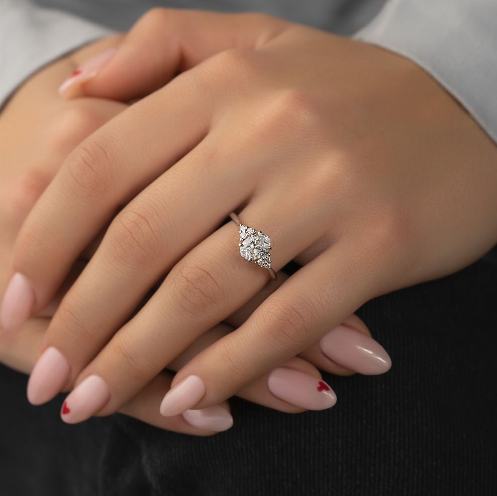The glittering appeal of an oval-shaped diamond meets with two other classic stones in this best-selling diamond-studded setting engagement ring.