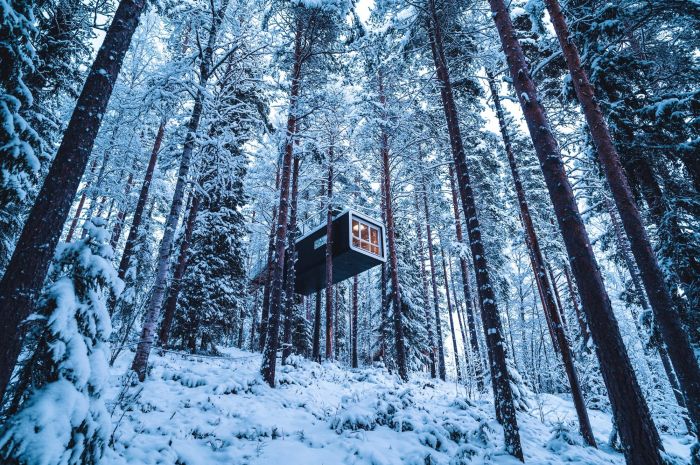 Come stay in the trees at one of eight unique rooms in the small town of Harads in the Swedish Lapland. Just an hour drive from Lulea Airport, winter in the forest here is magical. Suspended 10- to 30- ft in the air, guests are perched amongst the 70-120 year old pine tree-forest with accommodations designed by renowned architects, presenting a once-in-a-lifetime experience. Experience the winter night in the silent woodland of Swedish Lapland, awakening to the views of the snow-dappled forest canopy before choosing from one of their many winter excursions. From a classic husky safari to ice fishing trips to visiting a reindeer farm and Sami village, return to the property for dinner and watch the Northern Lights circling overhead. Whether staying in the Mirrorcube, Biosphere, Ufo or other rooms, comfort and modern design are combined for an exciting adventure.