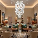 Inside, the lobby reflects this powerful sense of scale, with a spacious floor area and a high sweeping ceiling overhead. Overhanging sets of crystals create a dream-like interplay of shadow and light on the cream colored floor. Decor is contemporary with a hint of art deco and industrial design with wrought-iron stanchions and covered piping above, all painted in black and grey muted tones. A gleaming grand piano pays tribute to the building’s erstwhile heritage as a former factory making this particular musical instrument.