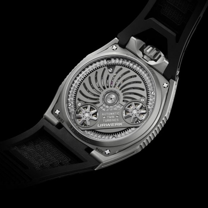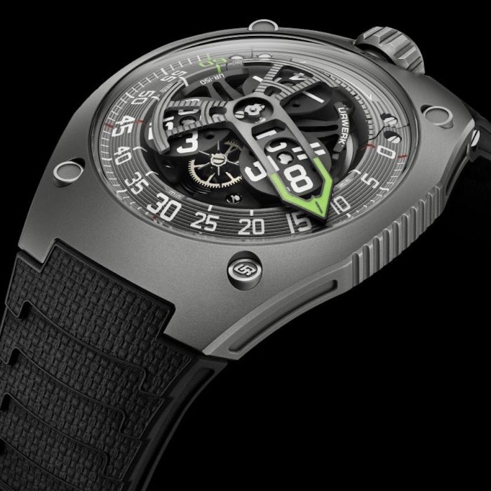 Powering the watch is a sophisticated double turbine self-winding movement developed in-house. The Calibre UR-50.01 comprises 38 jewels and oscillates at a frequency of 28,800 vibrations per hour. This mechanism features production techniques such as circular graining, sandblasted, shot-blasting, and circular satin finishing which is visible via the sapphire crystal exhibition case back. Functionally the UR-150 Scorpion features satellite hours and minutes. The watch also has a power reserve of 43 hours and is water resistant to a depth of 50 meters.